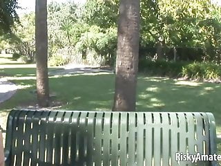 Heisse Blondine zeigt ihre rosa Pussy im Freien
